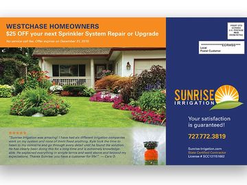 Every Door Direct Mail (EDDM) was a cost-effective way for Sunrise Irrigation to develop new business in the Westchase neighborhood. With EDDM, pieces are delivered to every household on select postage routes in the neighborhood, for a low postage rate and without the need of buying a mailing list.